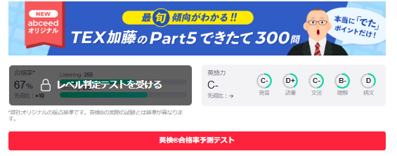 ホーム画面の左上に、アミが掛けられて「レベル判定テストを受ける」と書かれた部分があります。そして、その下に赤く長細い帯で「合格率予測テスト」のバーがあります。アミの部分、または赤いバーどちらかを押すとテストが始まります。