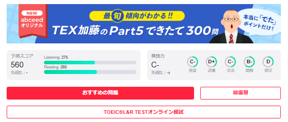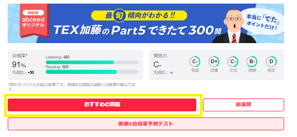 やっと本題に入れます。判定テストで実力が出たところで、abceedの本領が発揮されます。AIにより、弱点を克服して点数を上げるための問題がセレクトされます。そう、これが「おすすめの問題」なのです。