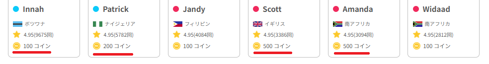 予約に必要なコインは一律ではありません。人気の講師は1レッスンの予約に必要なコインが多く、新人や評価が低い講師は少ないコインで予約可能です。つまりコイン数で講師のランクが分かります。