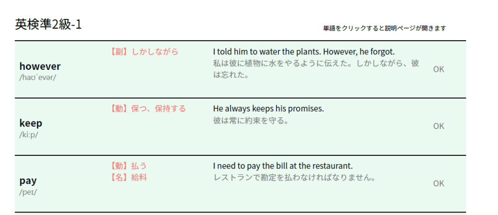 単語の詳細ページが表示されました。左カラムにそのステージの一覧単語があります。